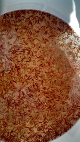 Mark has a really nice way of rinsing them. Start with three small bucket/bowls of fresh water in a row. Net as many shrimp out as you can and let it drain for a few seconds then just repeat the process through the fresh water in the smaller buckets. There will be lots of left overs in your original bucket(s) so I just keep those alive to feed.
