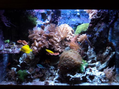 As with many people I began my addiction with a very small, 1 gallon, freshwater aquarium given to me as a christmas gift at the ripe old age of 8 years old.  I was hooked immediately.  Next year, I got an upgrade to a 10 gallon for christmas, then added a 20, a 29, and soon had 4 freshwater tanks all running smoothly and looking awesome.  I continued fueling the addiction with the help of my parents pocket books until I turned 16 and began working at a Pet/fish store in Logan, Utah.  This store had become my favorite before working there, and they had a very nice saltwater selection, (or at least it was at it's time.)  While there I set up more challenging freshwater systems, and then the owner got me to dive into Saltwater, and I've been hooked ever since.  I took a break while serving an LDS mission, but upon returning the bug hit me hard.  When I got home I had not running tanks of my own.  I quickly set up more Fresh Tanks, then designed and planned a 65 gallon reef.  That reef, is still my current reef today, and has been running for 5 years now, it looks awesome, but is mostly softies with a few sps mostly Monti's a few small acros, and some LPS. Here is a picture of it as of the day after christmas.