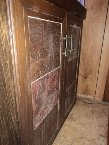 And here is a shot of the custum stand I built for the tank, the doors have a slate tile inlay which look very classy, especially on the stone floor that the tank stand sits on.
