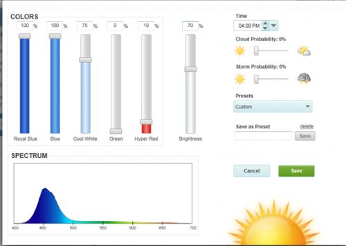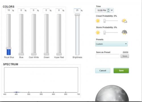My buddy Evan127 motivated me to post up my settings vs email them out . It is not all the night data points as I do have some settings for a moon effect that change a little through the nite but it is the main daylight settings. I sometimes change the start and end times for daylight savings and I may have bumped each data point Brightness (not the color%) up buy a few % (1%-5%) since I took these screenshots. These settings are not going to give you those color popping blues in the middle of the day, you only get that in the morning and night (typically when I am looking at my tank). Late morning to late afternoon its going to be pretty white. I have two lights on a 65gallon 8 inches off the water.