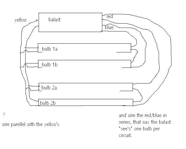 hrmm... but.. what if i just run a wire from the pole on the tubes to the pole on the same next tube.. if it has enough power to fire 2 8' VHO's then it should have enough power to fire 4 48" bulbs if i wire them like they are 2 8' bulbs... correct??? here is what im thinking...  so id wire it like this instead...
