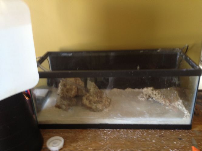 I have been waiting to set up a tank until I could afford to do the one I really want (something big 150+), but I couldn't take it anymore. So I rummaged through my basement and came up with a 20 gal long tank and a couple koralias. Found some dry rock in my garage, and so far have only had to buy a light and some sand. Thanks to Aquatic Dreams for the killer deals, I now have a tank started! I think I will end up with some designer clowns, but the wife is still out on that decision. Otherwise, it will be softies and lps. Maybe a rbta once things settle down. Playing around with some aquascaping ideas:  Final decision:  Adding water:  and finally, the cloudiness is dissipating:  Meanwhile, one of my dogs was not impressed that we were adding more pets to the equation: