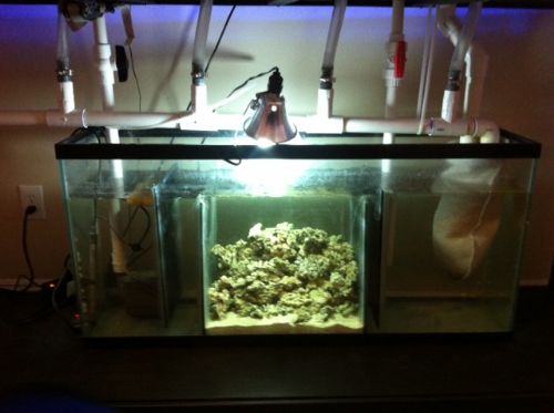 Well this project has been a long time in the making and is finally done! I thought i would post some pic of the build to show you all what i've been up to. The build begins!   Making sure its nice and strait   Finished product!  Another angle of the finished product. 2 tanks divided into 3 chambers each giving me 6 smaller tanks of about 11 gallons each.  The install  Water test to make sure they actually hold water  Bulkheads in  Figuring out how to plumb this bad boy skimmer!  The finished product fully installed, cycled and ready to add the broodstock!  Here is a shot of the lighting, i used a 48" and a 36" panorama stunner strip  Left side  right side  right side and sump  It was hard to get a good pic of the skimmer because of where it is placed. The skimmer is a My Reef Creations MR2. its a becket style skimmer and pulls some serious gunk!  This it the blueline pump that powers the skimmer  Shot of the sump/refugium. Its a 55 gallon sump i built, huge refugium with about 20 lbs of live rock rubble with a GLO refugium light to grow the macro when i get it in this weekend. The return pump is a Mag 24 and its awesome! Both the return from the tanks and the skimmer empty into the filter sock.  Thanks for checking it out. Its been a ton of work and took me a lot longer than i thought it would. Please let me know what you think and if you have any questions!