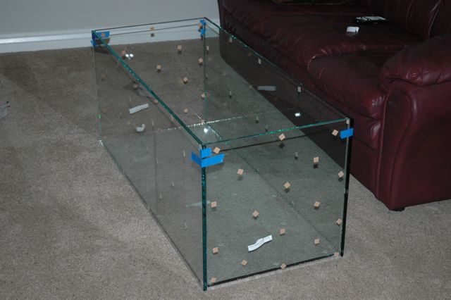 I have thought about placing the overflow on the outside, but I'm space limited where this tank will go, so I want to place it as close to the wall as possible. Placing the overflows on the outside on a rimless tank is possible, but not something practical for this tank. If you notch the back glass on a tank like this, you have to be very carefull that you don't inadvertently introduce a weak area, and this takes some special precautions (in my opinion).