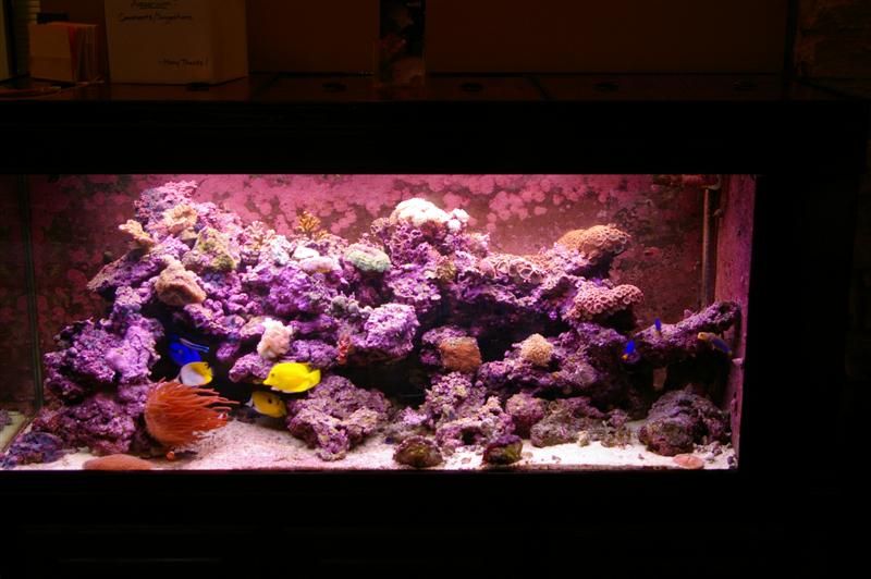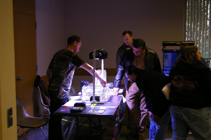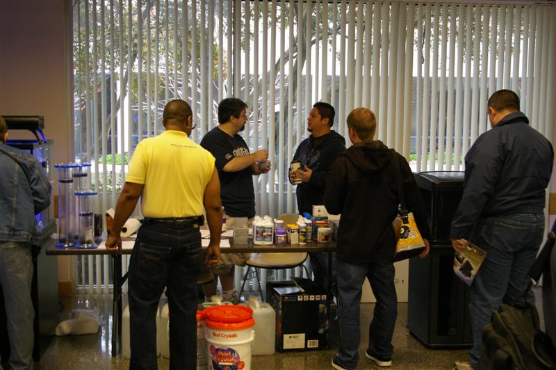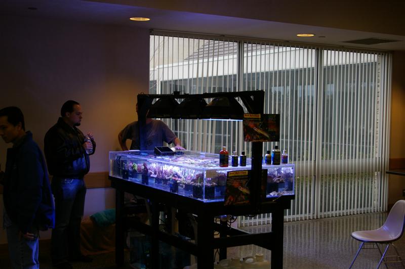 After Jake answered a few questions it was time for lunch.  Due to unavoidable complications lunch was not provided by the club.  Instead everyone was on their own for lunch.  The club had put together a 6 page list with maps of restaurants within just a few miles of the botanical gardens.  Those that did not feel they needed lunch could stay and hang out with the vendors in the vendor hall learning about supplements that were being offered for sale, purchasing frags or hard goods and just generally chatting and having a good time.  This was also a great time to buy raffle tickets and check out all the raffle items that were up for grabs.  They had a lot of really cool raffle items.  Everything from Supplements to Frag packs and hard goods such as RO/DI filters and photo boxes from Melev's Reef, a 29 gallon Oceanic Biocube, and a 60 gallon tank and stand from one of their LFS that was there as a vendor.  Lunch was also a great time to check out the 90 gallon tank the Botanical Garden keeps.  They had a nice looking reef with many of the same corals we keep, such as frogspawn, Kenya tree, etc.  To us aquarist the corals looked kind of sad and not very well stocked.  The fish on the other hand were absolutely beautiful.  They had a Blue Tang, Yellow Tang, Royal Gramma, Scooter Blenny, a Dwarf Lionfish, 2 clowns in a rose bubble tipped anemone that had recently spawned and were caring for their eggs on the bottom of the tank, and 2 of the most beautiful Blue Spot Jawfish I have ever seen.  Their fish were in absolutely perfect health.  None of them had any blemishes on them and they were all very friendly active fish that did not go hide when the tank was approached.  One of the blue spot Jawfish even hung out 6 or 8 inches from it's hidey-hole almost all the time without feeling the need to retreat to it.  The other stayed in its hole, but kept watch with its head sticking out the whole time.