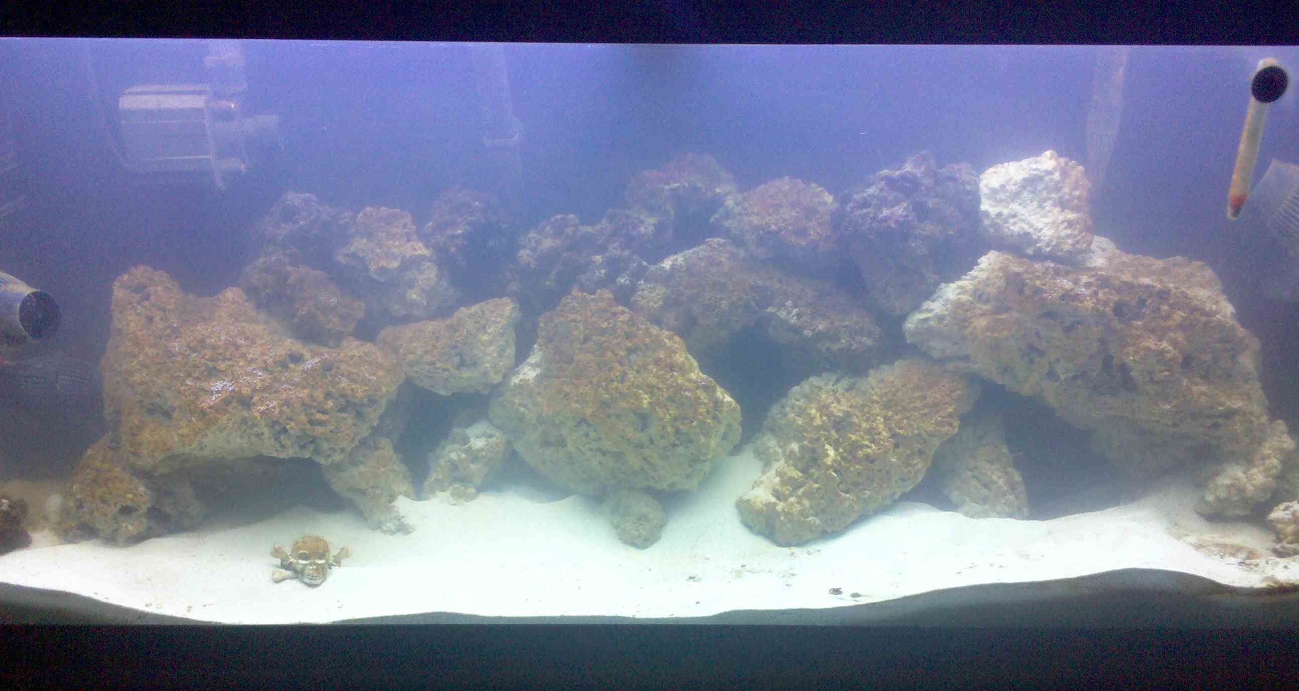 A little Update: Sorry, but its another cell phone pic ... Got the live rock, a little live sand, topped tank off with 8 gallons of live water, powerheads, light fixture, and skimmer going. The other remora pro skimmer should be here tomorrow....it may be overkill to use both, so might sell the red sea prizm.(if anyone is interested, let me know) The water has finally started to clear up ! Placing rock isn't easy, it seemed to take forever to get the rock positioned where it had a strong foundation. Now, I am no expert but any advice on improving the rock would be great. Then again, I am happy enough with it... and out of frustration and laziness may just leave it be for a few days, instead of kicking up more sand. Now as far as the cycle goes, do I need to add something to spike the ammonia so it kicks the cycle into gear? I hear mixed reviews about this, some say add some fish food a little daily, others say a piece of shrimp, etc. Advice is much appreciated.