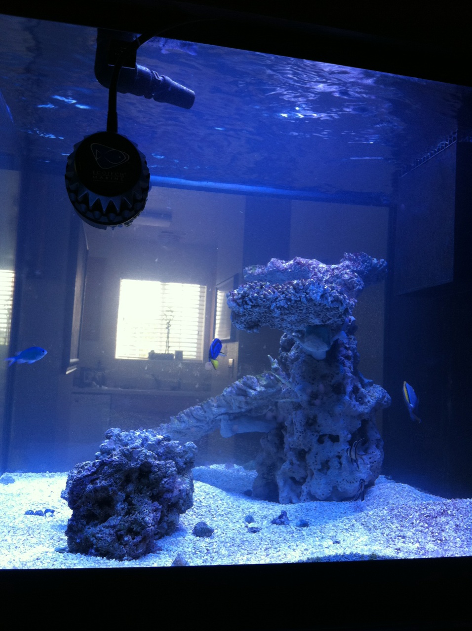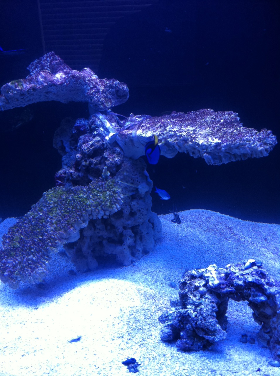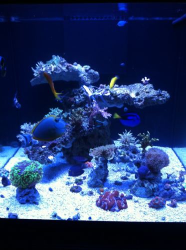 The only changes to the aquascape was a small arch that my wife really wanted. I feel that it adds a lot of debth and personality to the tank. We have added a few fish to the tank since I posted last. All include: Blue Tang(from our biocube) Blond Naso Tang 2 Neon Gobies 2 Bangai Cardinal fish