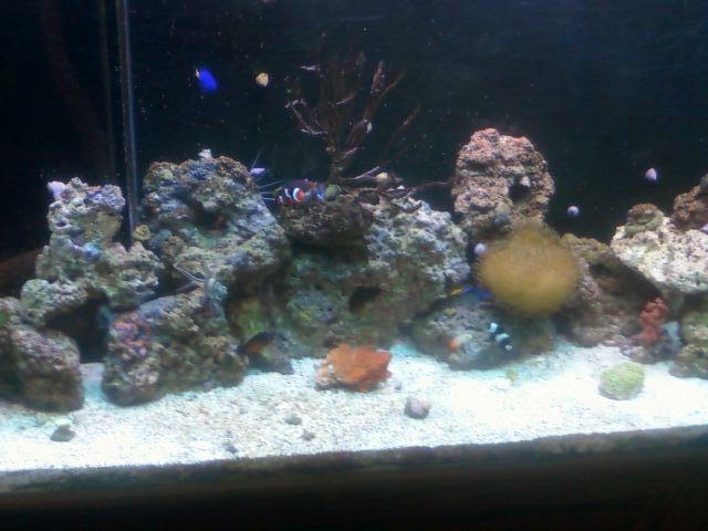 I took that pic yesterday when I got home and the water looks a 100 times better still not crystal clear, I think my filter bagg was a problem it was blocked I rinsed it out, I still have the bag of chemi-pure inside of it?? Not sure if I should take it out and put it in the bottom of the sump tank or leave it in the bag?? How about my rock?? do I need more space between them or do I need them higher in the tank? Not sure about the placement and the water flow. My return has two tubes and I have them pointed one going down about half and one making waves on the top. On the otherside of the tank I have a power head that curculates back to the side??