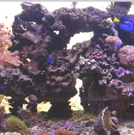 Ich can infest the tank and every fish can get it and die, wrasses included. Some fish we call "Ich Magnets" because the parasite loves their body. These are the Blue Tang and Powder Tangs. Something about the body of Tangs seems to be an ideal place for Ich to live. Unfortunately it also can infest the gills of most if not all fish. The Ich Parasite lives for a long time in an aquarium without fish. It only takes a drop of water to reintroduce the parasite in one of it's forms. A single parasite might survive on a fish even after being treated in a hospital tank and it only takes one to produce 20 more. It can come in on LR, Coral or anything wet. That's why I strongly encourage the gaining of knowledge about: 1- what makes a healthy tank in which fish feel very happy and 2- to find and use a workable Garlic Oil for five days after introducing every new fish and periodically thereafter(even after changing things in the tank that stressed them). LR needs room all around it for water to flow so positioning of the rock can make a big difference, especially in the long term. An example of the aquascaping I am speaking of is in the pics below. I believe there is a Reefkeeping Tip about the "Tripod" method of placing LR. Rock is not really placed this way in the ocean but for our tanks it makes them much healthier places to live because we don't always have the advantage of wave and current action moving water all over. The Octopus is definitely a step in that direction though. Sand needs to be refreshed. More important than vacuuming is to stir it up like a big ocean storm from time to time. Vacuuming can be done, but I recommend only once or twice a year in selected small areas only, where detritus is most commonly building up. Stirring the sand, on the other hand, is a very beneficial action. It is just the simple action of using a stick or your hand poked and wiggled down to the glass and stirred to bring detritus out into the water where all inverts (coral, worms, bugs, feather dusters, clams, shrimp, fish, etc.) can feast on it. Yes, they all find something delicious from the stirred sand. Stir small spots every week or two to treat your tank.  These are pics of a tank I ran for a few years in St. George, UT