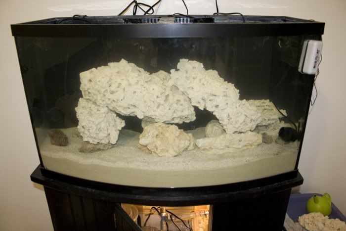 I've put in about 3 inches of oolitic sand and then will seed it with some LS that bugzme was kind enough to offer me. Then I think I'm going to finish off the four inches with some larger grain sand on top.
