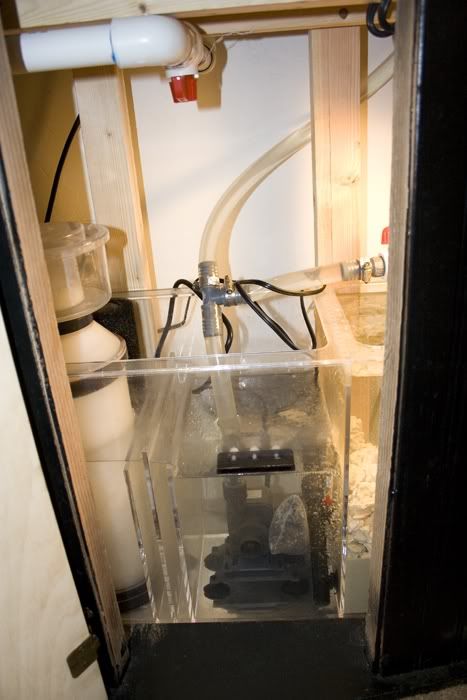I had to cut out the back of the stand and replace it to get the sump in, and then I finished up all the pluming this afternoon. I started mixing up saltwater as well, but it is going slow as I have no RO filter and am making runs to Good Earth to fill up my two 5 gallon jugs.