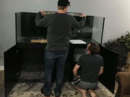 Now to get the stand and tank inside. Tank weight over 350 pounds so I enlisted 3 Marines and a neighbor..