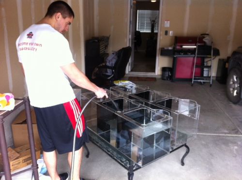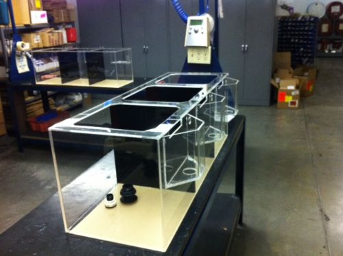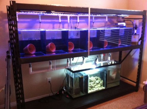 Well this project has been a long time in the making and is finally done! I thought i would post some pic of the build to show you all what i've been up to. The build begins!   Making sure its nice and strait   Finished product!  Another angle of the finished product. 2 tanks divided into 3 chambers each giving me 6 smaller tanks of about 11 gallons each.  The install  Water test to make sure they actually hold water  Bulkheads in  Figuring out how to plumb this bad boy skimmer!  The finished product fully installed, cycled and ready to add the broodstock!  Here is a shot of the lighting, i used a 48" and a 36" panorama stunner strip  Left side  right side  right side and sump  It was hard to get a good pic of the skimmer because of where it is placed. The skimmer is a My Reef Creations MR2. its a becket style skimmer and pulls some serious gunk!  This it the blueline pump that powers the skimmer  Shot of the sump/refugium. Its a 55 gallon sump i built, huge refugium with about 20 lbs of live rock rubble with a GLO refugium light to grow the macro when i get it in this weekend. The return pump is a Mag 24 and its awesome! Both the return from the tanks and the skimmer empty into the filter sock.  Thanks for checking it out. Its been a ton of work and took me a lot longer than i thought it would. Please let me know what you think and if you have any questions!