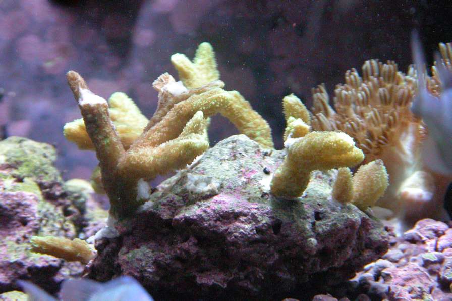Here's a full tank shot. You should post some pictures of your new colorful montis. I really want the blue next time. My hydnophora got a bad brown jelly infection where it was injured so I fragged it and threw out the stinky rotten base. Then I superglued the frags into a little "frag forest". I hope the brown jelly is done- that stuff is horrible.