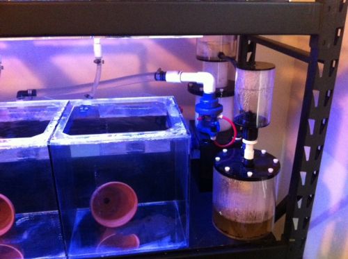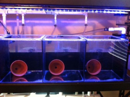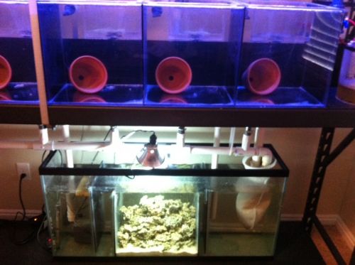 Well this project has been a long time in the making and is finally done! I thought i would post some pic of the build to show you all what i've been up to. The build begins!   Making sure its nice and strait   Finished product!  Another angle of the finished product. 2 tanks divided into 3 chambers each giving me 6 smaller tanks of about 11 gallons each.  The install  Water test to make sure they actually hold water  Bulkheads in  Figuring out how to plumb this bad boy skimmer!  The finished product fully installed, cycled and ready to add the broodstock!  Here is a shot of the lighting, i used a 48" and a 36" panorama stunner strip  Left side  right side  right side and sump  It was hard to get a good pic of the skimmer because of where it is placed. The skimmer is a My Reef Creations MR2. its a becket style skimmer and pulls some serious gunk!  This it the blueline pump that powers the skimmer  Shot of the sump/refugium. Its a 55 gallon sump i built, huge refugium with about 20 lbs of live rock rubble with a GLO refugium light to grow the macro when i get it in this weekend. The return pump is a Mag 24 and its awesome! Both the return from the tanks and the skimmer empty into the filter sock.  Thanks for checking it out. Its been a ton of work and took me a lot longer than i thought it would. Please let me know what you think and if you have any questions!