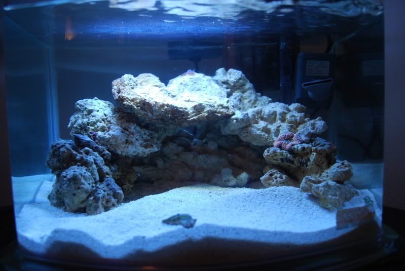 I filled it up last week using 1.5 gallons of water from my big tank and 1.5 gallons of new mixed up RO water. I used some smaller live rocks I had that wasn't really doing any good in my big tank and got a few more little pieces from Will Spencer (thanks Will!) for a total of 6-7 pounds of rock. I also used 6.5 pounds fiji pink live sand for the sand bed with a couple of cups of sand from my bigger tank mixed in. I figured this would lead to almost zero cycle - and I was correct. All levels were good within three days.