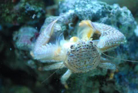 Now we have the porcelain crab! This guy is probably the coolest thing in there right now. He's about the most awesome crab. I like the look of my pom pom better but he never comes out and the porcelain is always out scooping out particles. Lots of personality. (Bonus two for one shot - Spot Big Red!)