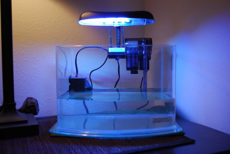 A couple of weeks ago I was asking about PICO's on here. Well I went out and bought one. In the end getting it from marinedepot.com ended up being the cheapest option. I got the JBJ Picotope. Pretty cool little three gallon tank. I've decided that for the next few months I'll just got with the default equipment with the exception of a Rio 50 powerhead for flow.