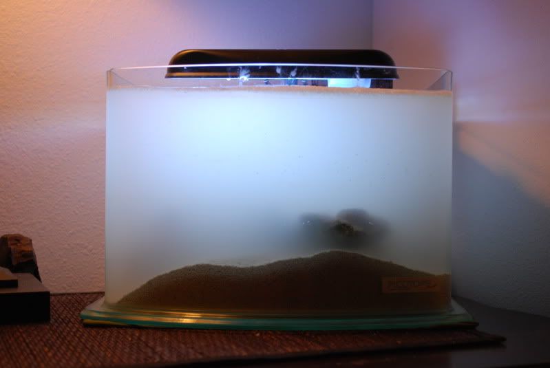 After it cleared up I did some aquascaping! What took me literally weeks to do in my 45 (I'm picky and couldn't decided on final placements) took me about 15 min! It's lot easier when you only really have five little rocks!