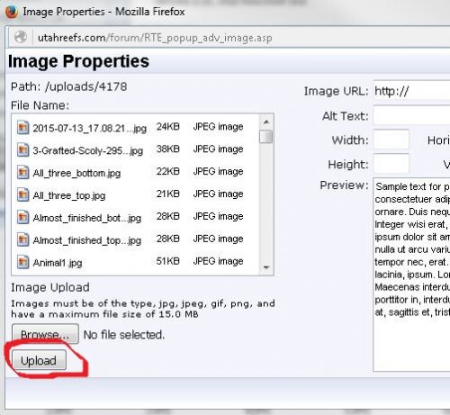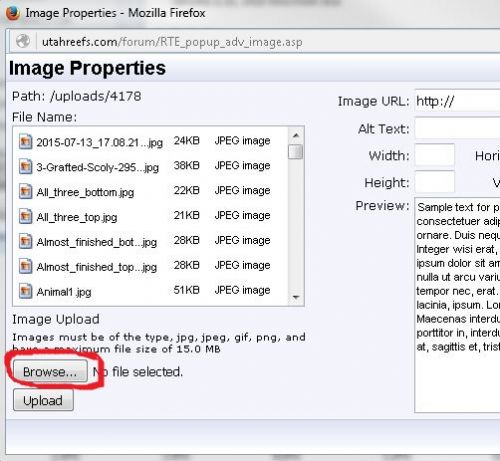 In the image properties box that opens, click the browse button. On a computer this will open the standard file browser to find the file. On a mobile device it will open other option that will take you to your gallery or photos. They all differ so you will have to poke around a little and figure out how to find the file you want (iPhones will have problems if you don't rename the picture prior to trying to upload it to the site It tries to use the same file name for every file it uploads and you will get an error from the forum that the file already exists).