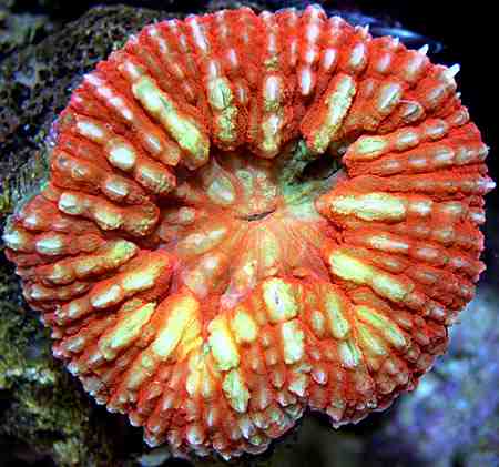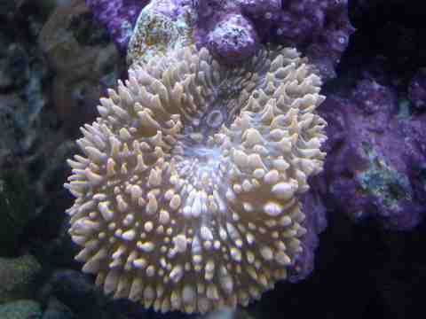 Captive Care, Eric Borneman: Lobophyllia are common Indo-Pacific corals in the aquarium trade, very hardy, tolerant and highly recommended. Their polyp tissue expands greatly in captivity, and feeding tentacles are usually visible at night, running sinuously along the prominent meandroid grooves, or from the margins between the oral and peripheral tissue. Naturally the tentacles occasionally extend during the day but can be trained to open as well. These corals readily take food offerings. If minimally adequate light and water movement is offered, they should grow well throughout the tank. Bright direct light and calm currents are optimal. Because lobophyllia are heavy-bodied corals, growth rates are not as apparent as other corals. Lobophyllia are fairly submissive to other corals (despite their feeding abilities), and recession is their most likely problem. Lobophyllia have been known to produce sweeper tentacles to fight off adjacent corals.
