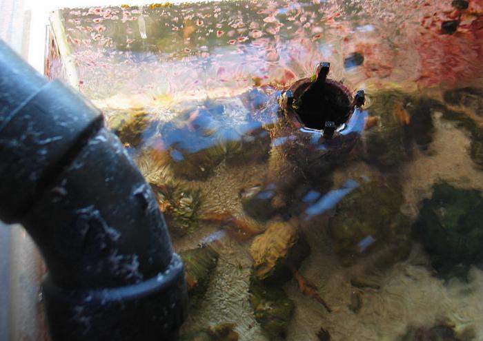 2. Corrugated 1" plastic RV pipe. The thin wall white RV pipe extends with a curl more than a foot into the water in the sump. The corrugation disturbs and slows the water flow. The length of pipe extending down into the water causes the water to pool before it slowly exits the end of the curled pipe. Micro air bubbles, instead of shooting directly into the sump, collect into larger bubbles which rise out of the bottom end of the pipe at intervals.