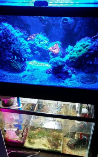 This update is a few days old. I've added caulerpa and chaeto to the fuge. Amphipods can be seen in the fuge. I added 5 hermits and a pocillapora to the display. All are doing well. Ammonia and nitrite at zero. Nitrates between 10 and 20. I've added more time on to the light in the display and I've seen a little color start. Algae in fuge is already growing. I'm trying to be patient. Edit: I'm also excited about tiny feather dusters and a spaghetti worm in the tank. I keep looking, hoping to see more.
