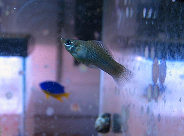 Here are pics of a female Molly and a male Molly that Seti007 caught at Sea Base. I've had them in one of my reef tanks for months. I tried to get a pic of them together but they just wouldn't hold still. There is also a lone baby Molly in the tank. I'm surprised that the Kupang Damsel hasn't eaten it.